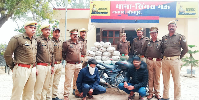 पुलिस अधीक्षक जनपद डा0 अजय पाल शर्मा के निर्देश पर अपराध एवं अपराधियों व अवैध शराब और मादक पदार्थों की खरीद फरोख्त की चेकिंग, वांछित व वारण्टी अभि0गणों की गिरफ्तारी हेतु चलाये जा रहे अभियान के क्रम में थानाध्यक्ष तरुन श्रीवास्तव मय हमराह उ0नि0 धुरेन्धर प्रसाद मय हमराह का0 नौशाद हुसैन, का0 अरविन्द कुमार मिश्रा, का0 कुलदीप गोस्वामी, का0 सौरभ सिंह,का0 राहुल रजक ,का0 सतीश कसौधन,का0 चन्दन यादव के देखभाल क्षेत्र,चेकिंग संदिग्ध व्यक्ति/वाहन व गश्त के दौरान मुखबिर खास की सूचना पर सिरकिना पुरानी पुलिया बहद ग्राम सिरकिना से अभियुक्त 1.विनोद कुमार यादव पुत्र स्व0 अर्जुन प्रसाद यादव ग्राम सिंघावल थाना सिंगरामऊ जनपद जौनपुर 2. आजाद सिंह उर्फ श्रीराम पुत्र स्व0 अरविन्द सिंह ग्राम संगुलपुर थाना जफराबाद जनपद जौनपुर को आज 51 किलो 300 ग्राम गांजा व अपराध में प्रयोग में लायी गयी पल्सर मोटर साइकिल नं0 UP 72 BB 2216 के साथ गिरफ्तार किया गया।